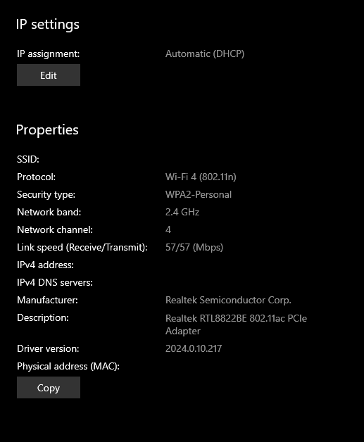 ستظهر لك نافذة الإعدادت، اذهب لآخر الصفحة وستجد جميع التفاصيل المتعلّقة بشبكتك، مثل معيار الوايفاي والسرعة القصوى للنقل بالإضافة لعدد القنوات ومعيار الأمان وغيرها.