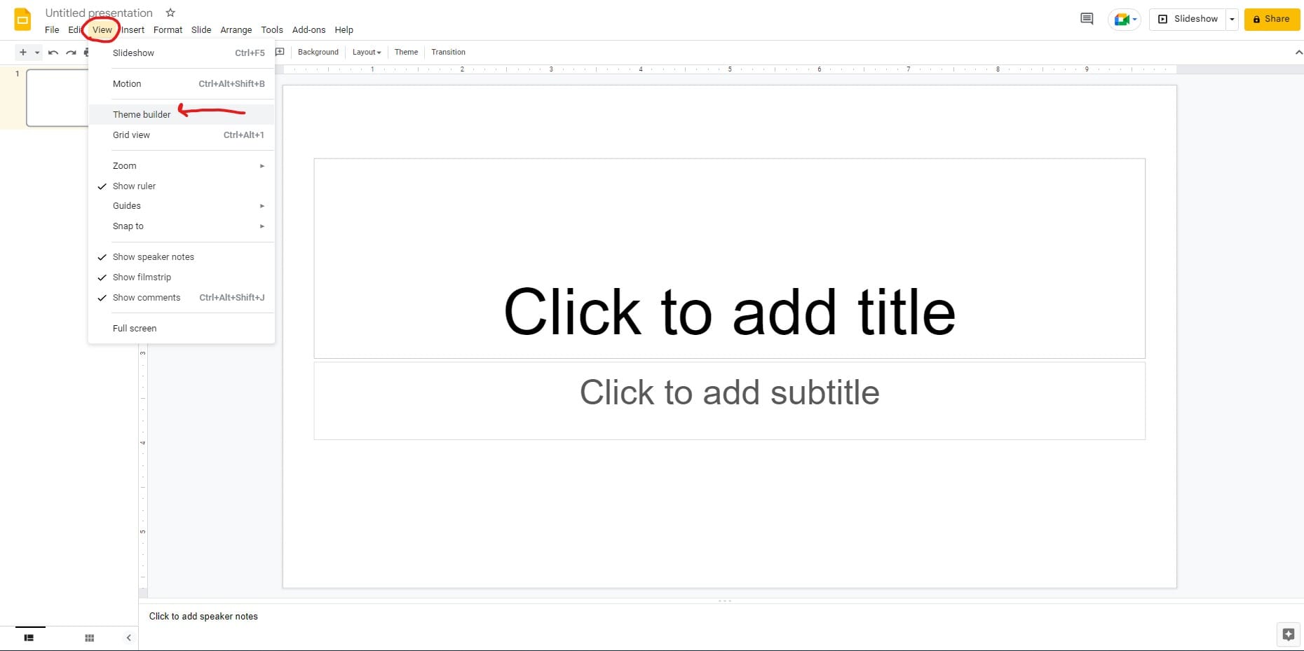 أول خطوة تحتاج الي فتح جوجل سلايد، ثم اختيار انشاء صفحة بيضاء او Blank Page، والتي بدورها ستفتح لك مشروع جديد، الخطوة التالية ستكون عبر اختيار قسم View بالاعلى ومن ثم اختيار Theme Builder.