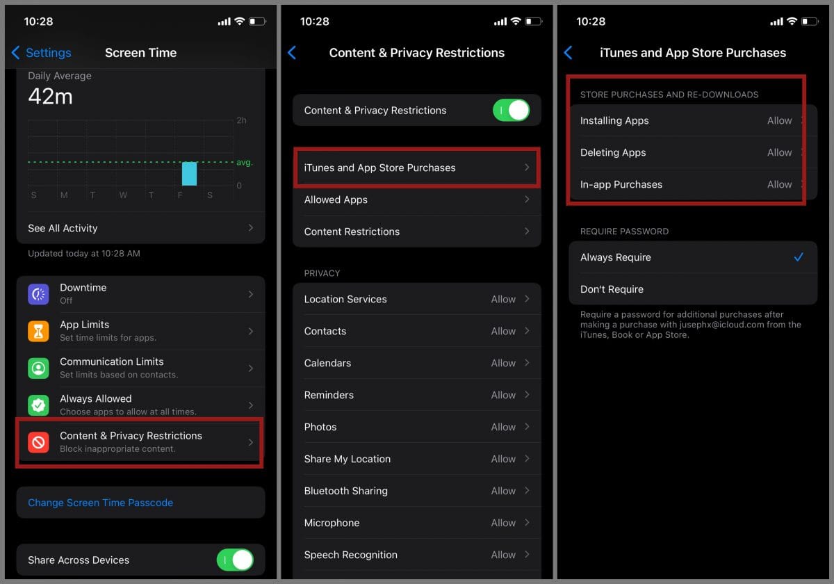 - الضغط على قيود المحتوى والخصوصية” ثم تحديد مشتريات iTunes وApp Store ضمن مشتريات المتجر وإعادة التنزيل.