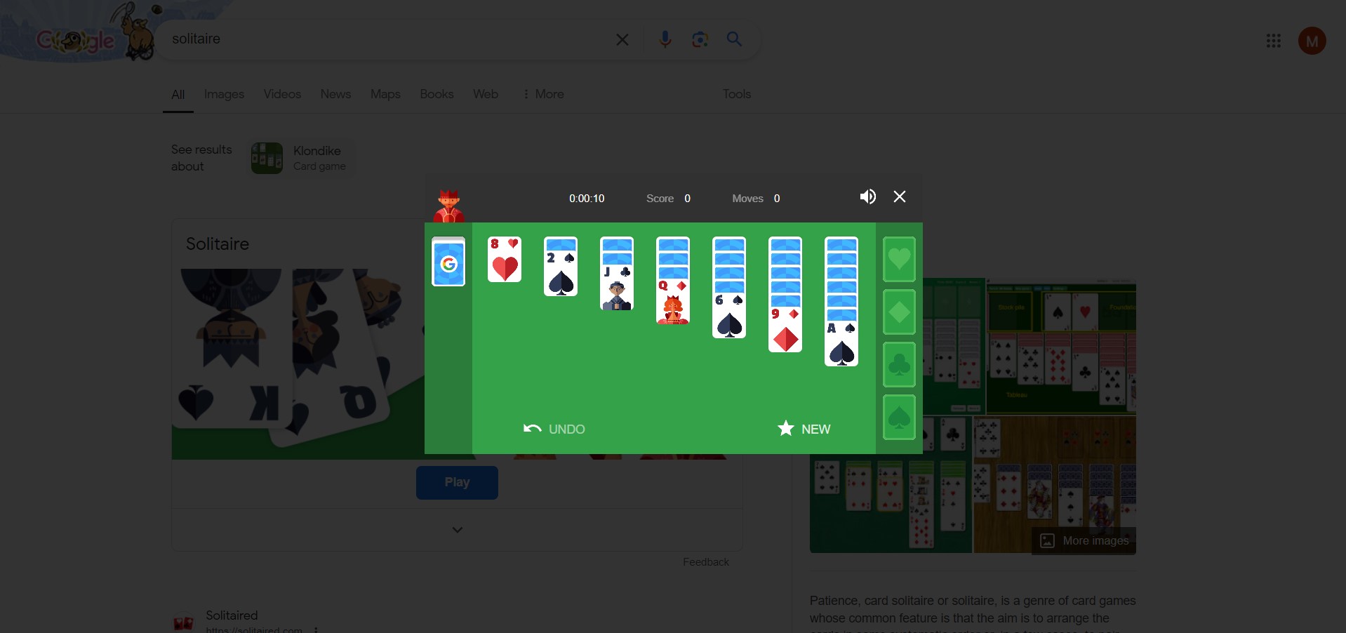 إذا كنت تريد تجربة لعبة تعتمد على التركيز، فلا شيء يضاهي لعب لعبة Solitaire. إنها لعبة فردية في الأساس، لذا فأنت وجوجل فقط. كل ما عليك فعله هو البحث عن “Solitaire” وسيسمح لك محرك بحث جوجل بلعب اللعبة في أعلى نتائج البحث.