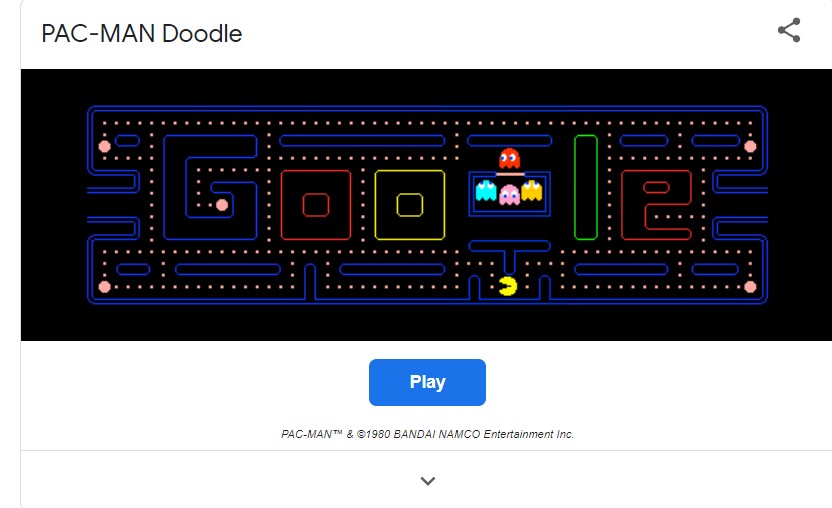 كانت لعبة Pac-Man واحدة من أكثر ألعاب الآركيد شهرة، ويرغب الناس حتى اليوم حتى في الاستمتاع باللعبة كما لو كانوا في الثمانينيات. لذا أعادها محرك بحث جوجل ويمكنك لعب اللعبة بمجرد البحث على جوجل. ابحث عن “Pac-Man” على محرك البحث وستجد شعار Pac-Man في صفحة النتائج. انقر على زر التشغيل واستمتع باللعبة كما لو كنت في الأيام الخوالي.