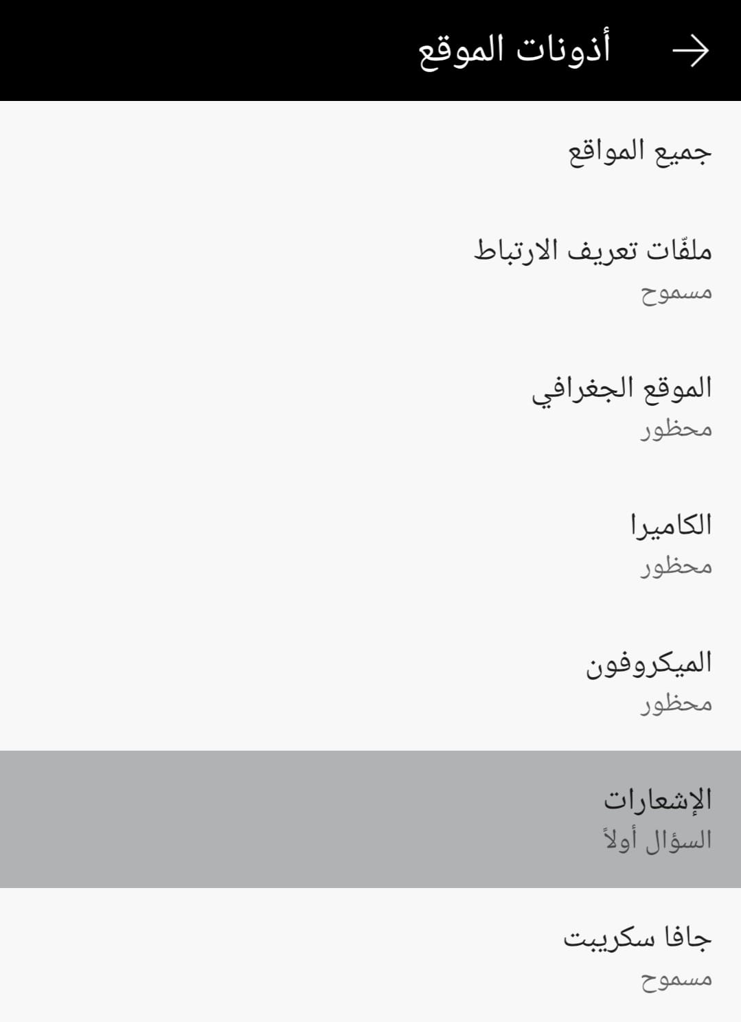 - بعد ذلك قم بالتمرير لأسفل ثم قم بالنقر على الإشعارات، وقم بالتمرير لأسفل مرة أخرى حتى يظهر لك قسم المواقع.