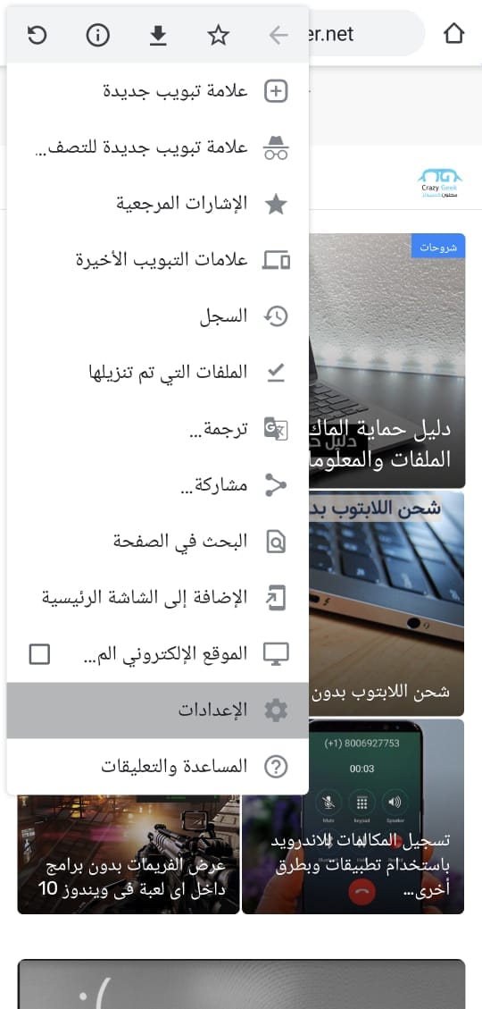 - أولًا قم بالدخول إلى جوجل كروم على هاتفك الأندرويد ثم قم بالنقر على علامة الثلاث نقاط أعلى يسار التطبيق وقم باختيار الإعدادات.