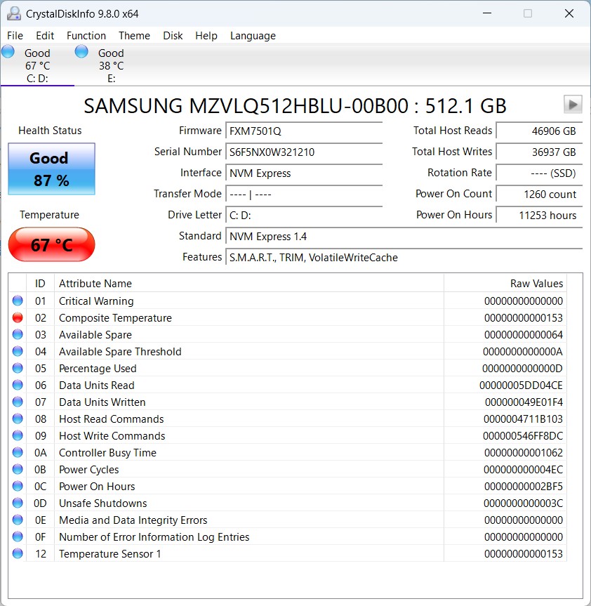 (صورة توضيحية: برنامج CrystalDiskInfo يعطي تقريرًا فوريًا عن صحة القرص)