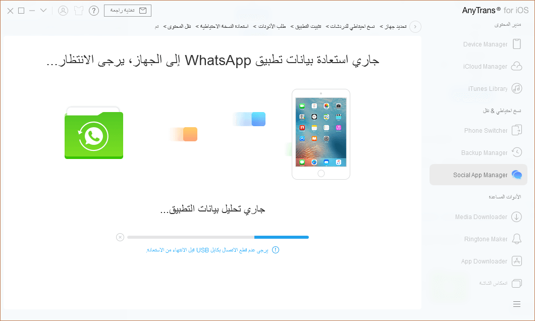 والآن كل ما عليك القيام به هو الانتظار حيث أن عملية نقل واتساب من الاندرويد إلى الايفون تعتمد على حجم النسخة الاحتياطية الخاصة بك وبعد الانتهاء يمكنك فصل الايفون واستخدام واتساب بدون أي مشكلة.