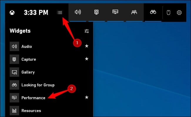 • قم بالنقر على زر ويندوز وحرف G لتشغيل شريط الألعاب ثم قم بالبحث عن نافذة “الأداء” ضمن النوافذ التي تظهر لك.