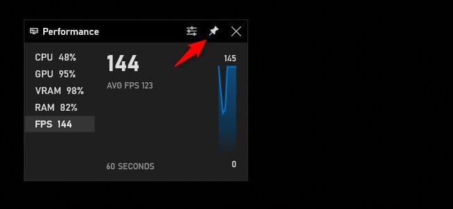 كما يمكنك تثبيت رسم بياني لمعدل الإطارات على الشاشة أيضًا لمتابعتها باستمرار أثناء اللعب وذلك من خلال النقر على معدل الإطارات FPS ثم قم بالنقر على السهم الأيمن (“>”)، ثم قم بالنقر على علامة التثبيت “الدبوس” في أعلى نافذة الأداء وبذلك سوف يظهر معدل الإطارات على الشاشة دائمًا حتى عند إخفاء Game Bar.