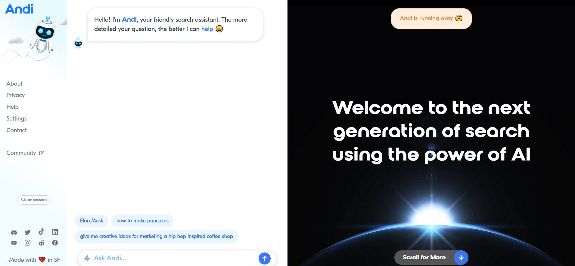 وهو محرك بحث يعتمد على قوة الذكاء الاصطناعي. فبدلاً من أن يقوم بتقديم مجموعة من الروابط والمصادر كنتائج بحث مثل جوجل، يبذل Andi جهوداً إضافية تسمح له بتقديم إجابات مختصرة للمستخدمين. مما يجعله يندرج تحت مسمة بوت ذكاء اصطناعي يعمل بالمحادثة.