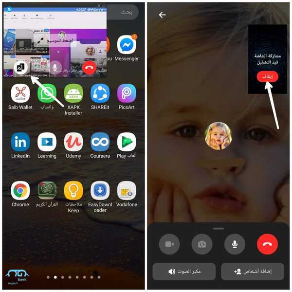 • الآن سوف يقوم تطبيق ماسنجر ببث شاشة الهاتف الخاص بك إلى الشخص الآخر، ولن يتم مشاركة الكاميرا، ويمكنك الآن الإنتقال إلى أي تطبيق، وعند مشاركتك للشاشة الخاصة بهاتفك مع أصدقائك سوف تلاحظ ظهور علامة حمراء أعلى يسار الشاشة، ولن تتمكن من مشاهدة الفيديو الخاص بأصدقائك ولكنك سوف تسمع صوته، ويمكنك إيقاف البث من خلال الدخول إلى المحادثة ومن ثم قم بالنقر على زر “إيقاف”.