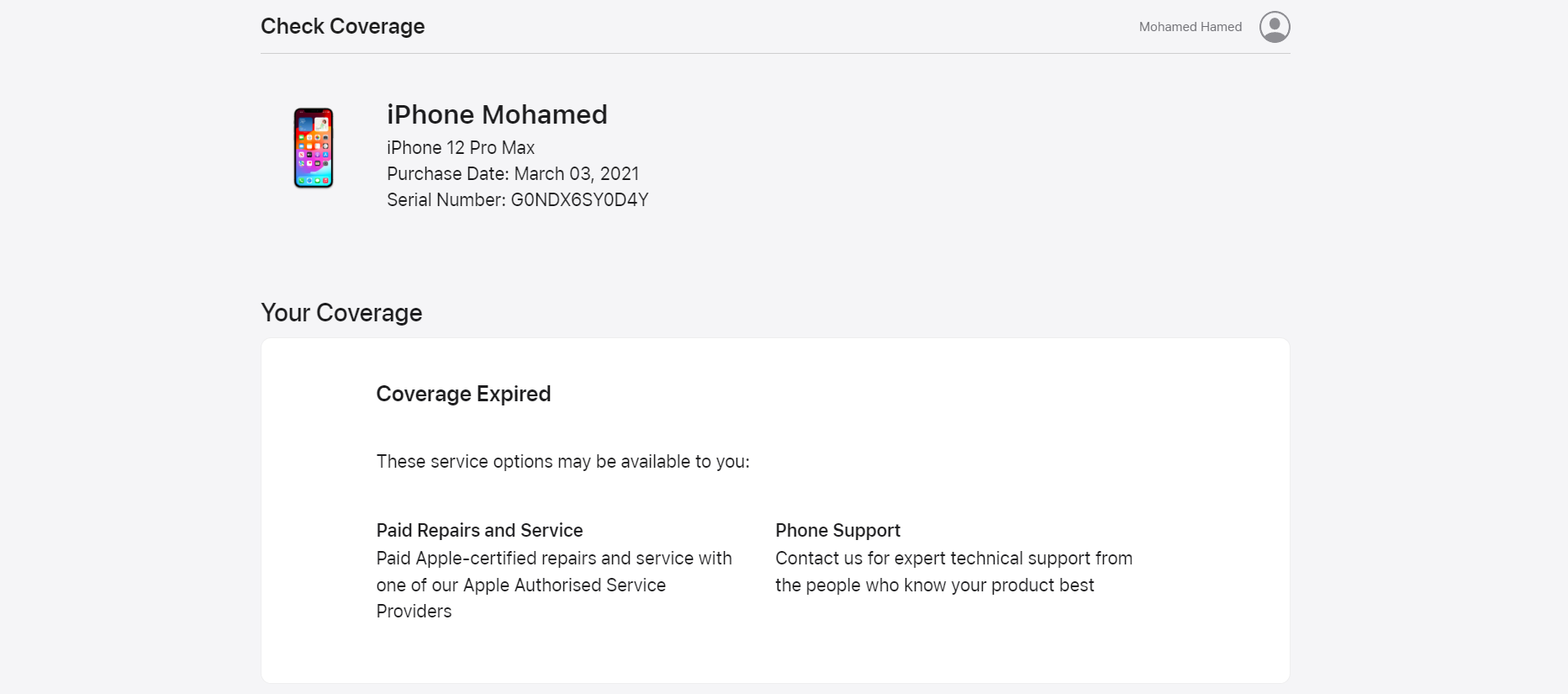 • في الصفحة التالية، سترى تغطية الخدمة والدعم، مثل تاريخ الشراء الصحيح والدعم عبر الهاتف والإصلاحات وحالة تغطية الخدمة وما إلى ذلك.