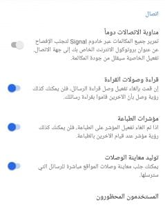 - مناوبة الاتصالات دائمًا: هذا الخيار يقوم بتحويل جميع المكالمات الصوتية عبر خوادم تطبيق Signal الآمنة والمشفرة والغرض من ذلك هو حماية بياناتك وتحديدًا الـ IP وعنوان بروتوكول الإنترنت الخاص بك بحيث لا يمكن لجهات الإتصال الأخرى الوصول إلى هذه المعلومات.